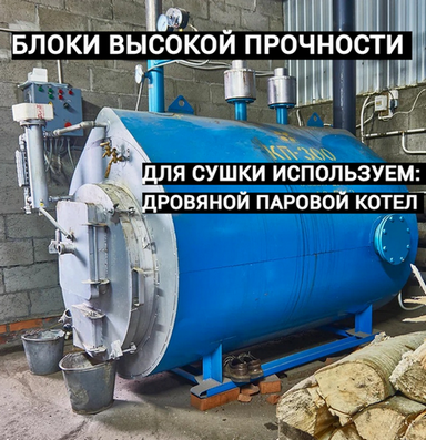 - Производственный процесс включает сушку блоков в дровяном паровом котле в течение 12 часов, при котором создается пар, способствующий укреплению структуры и повышению прочности блоков.